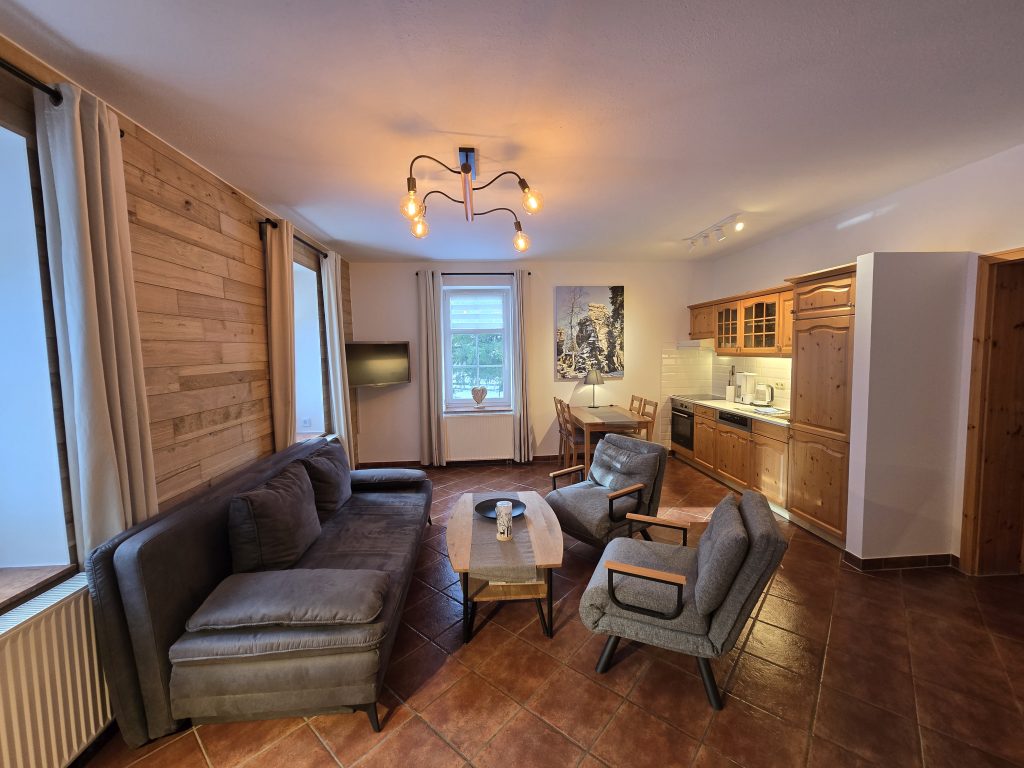 Das 2015 renovierte Komfortappartement „Bärenstein“ hat eine Größe von 52 m² und bietet Platz für 4 Personen. Es befindet sich im 1. Obergeschoss. Im separaten Schlafzimmer mit großem Boxspringbett lassen sich die Nächte genießen. Der Wohnbereich bietet einen Essplatz für 4 Personen und mit der Schlafcouch (2,00m x 1,65m mit Topper) Platz für zwei weitere Personen. Die offene Küche ist komplett ausgestattet inklusive Geschirrspüler. Im Bad befinden sich Dusche und WC.