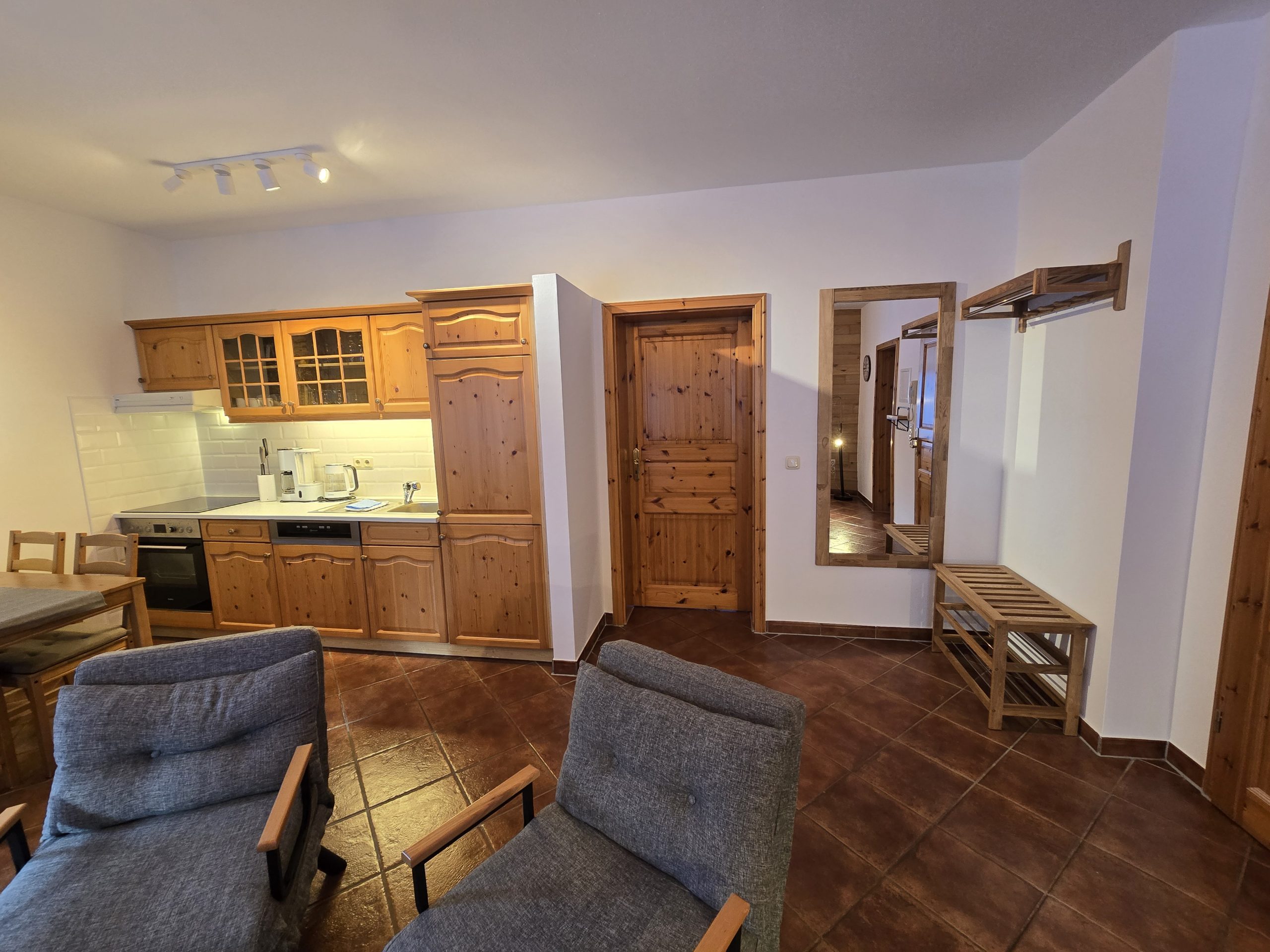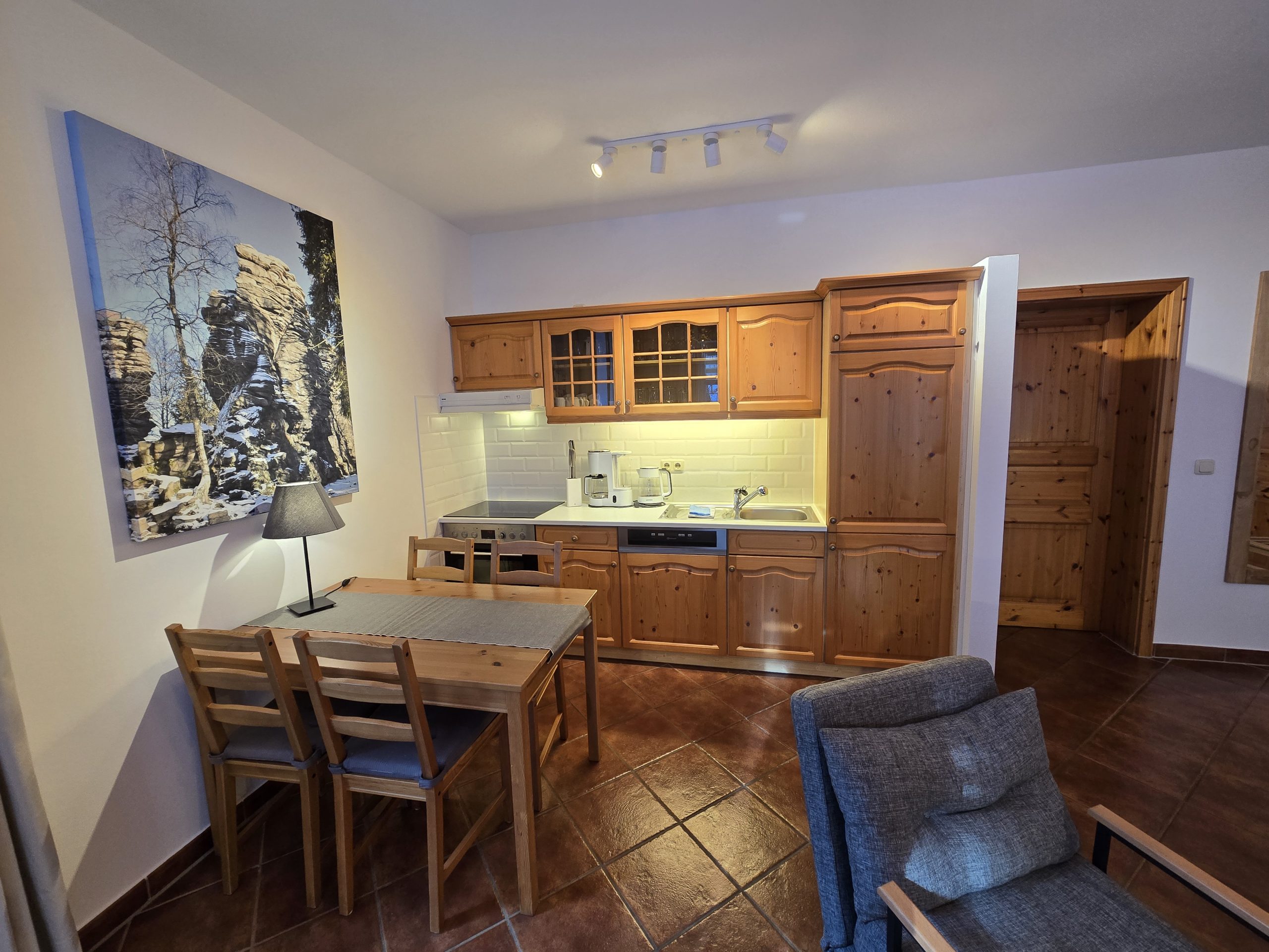 - Küche mit Geschirrspüler, Ceranfeld-Elektroherd, Backofen, Kühlschrank, Kaffeemaschine, Toaster, Wasserkocher